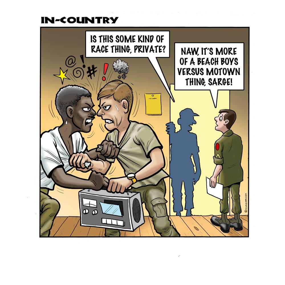 Phil enlisted in the Army in 1965 where he served for years in Vietnam.  He became a graphic designer and has worked for the state of Oregon for 26 years.  He retired in 2003 and started the Cartoon "In-Country".  The cartoons reflect his experiences during his tour of duty in South Vietnam.