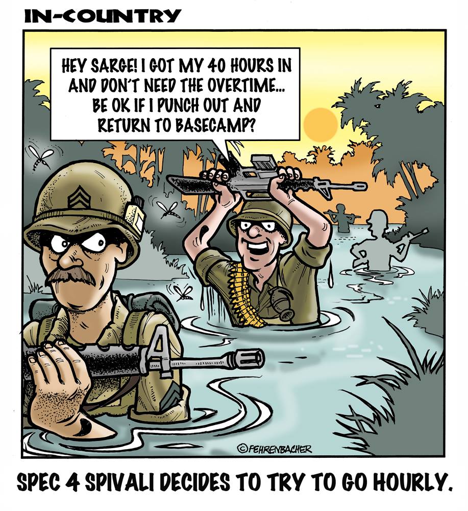 Phil enlisted in the Army in 1965 where he served for years in Vietnam.  He became a graphic designer and has worked for the state of Oregon for 26 years.  He retired in 2003 and started the Cartoon "In-Country".  The cartoons reflect his experiences during his tour of duty in South Vietnam.