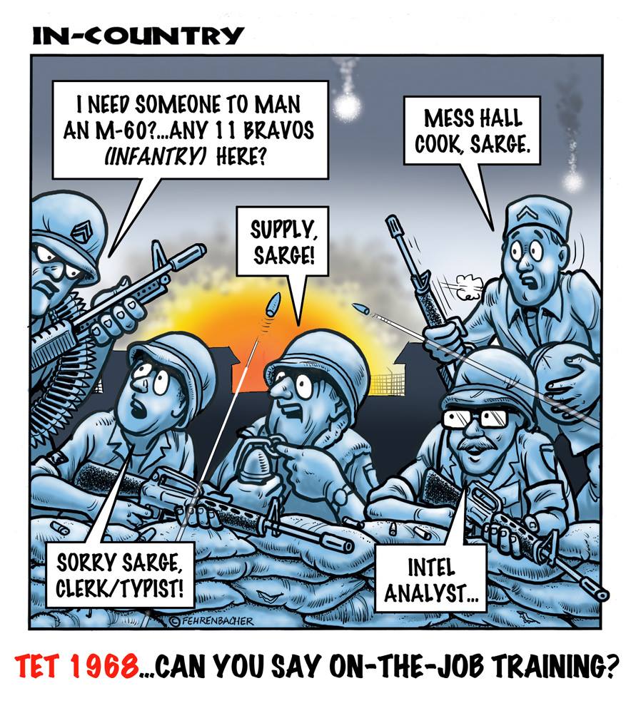 Phil enlisted in the Army in 1965 where you served for years in Vietnam.  He became a graphic designer and has worked for the state of Oregon for 26 years.  He retired in 2003 and started the Cartoon "In-Country".  The cartoons reflect his experiences during his tour of duty in South Vietnam.